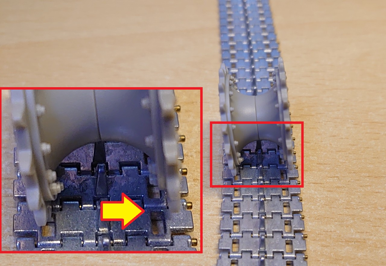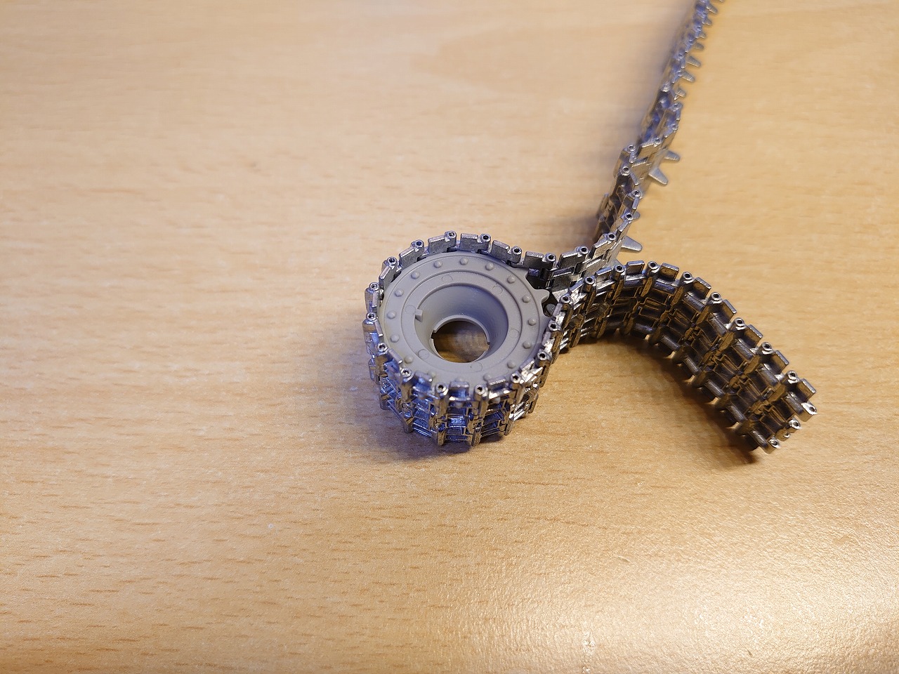 履帯をドライブホイールに巻き付けるとこんな感じです!履帯とスプロケットの距離はピッタリなのでそのまま使えそうです。