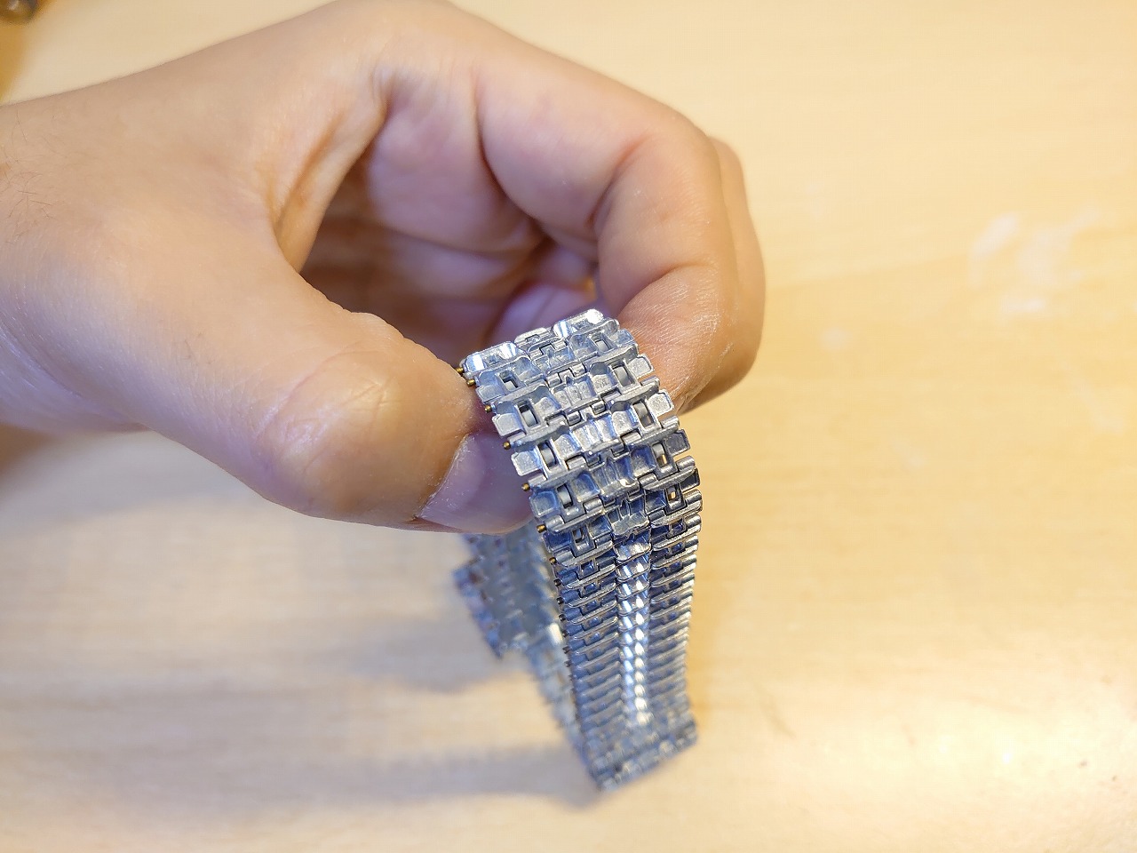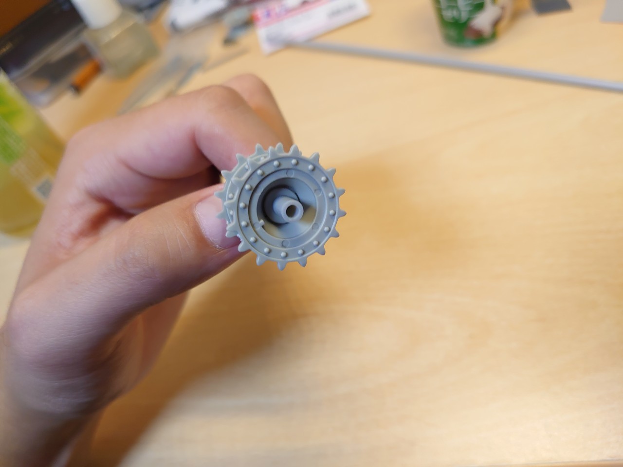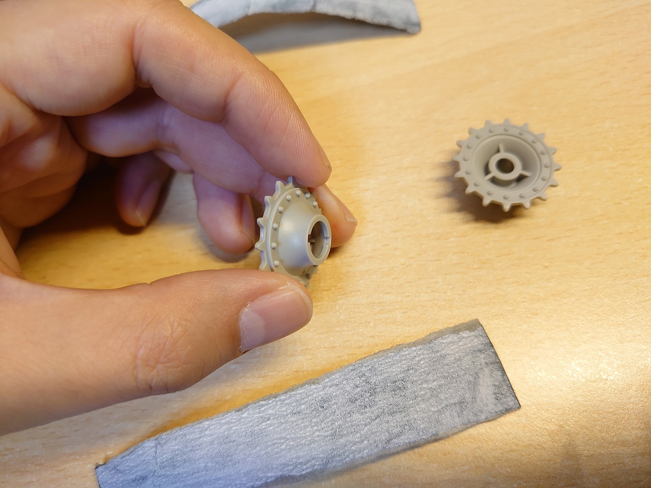 やることはシンプルで、ドライブホイールの穴の大きい方(上写真の手で持っている方)をひたすら紙ヤスリで削ります。ヤスリはタミヤの600番を使いました。もう少し目の粗い400番とか320番でも良いかも知れません。