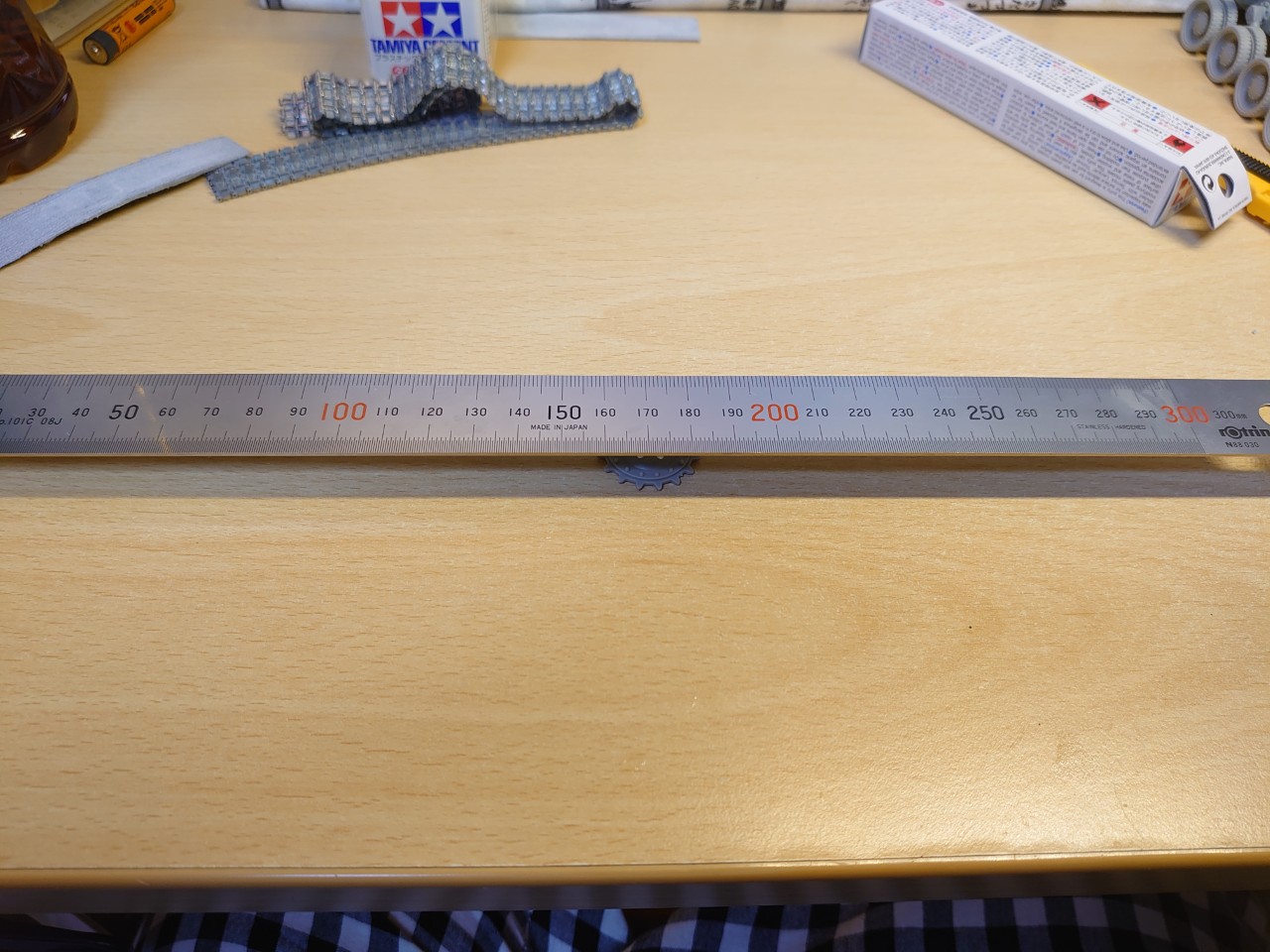 傾いた状態で削ってしまうと悲惨な事になるので、削り過ぎてないか手を止めつつ進めました。水平が取れているかはかなり原始的な方法で測りました。削ったドライブホイールの上に定規を置いて、定規が右側に傾いていたら右側削り過ぎだし、左側に傾いていたら左側削り過ぎだし。というのを何度も繰り返し微調整した感じです。最終的には以下のような形になりました。