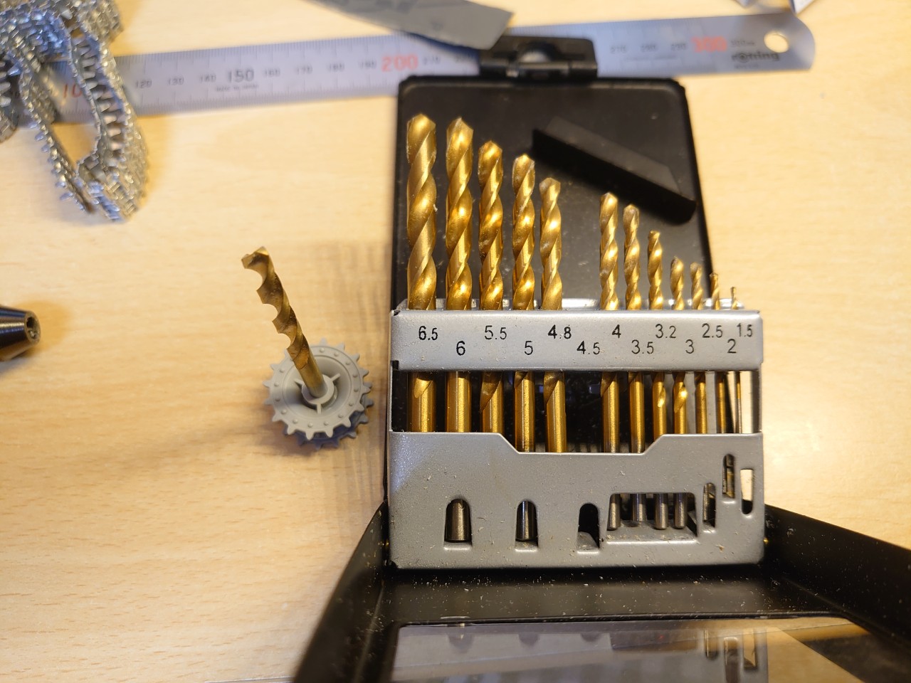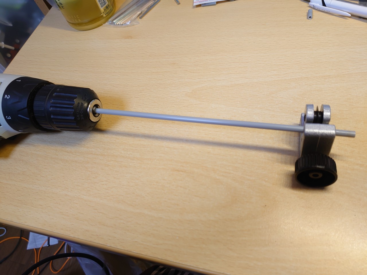 ドライバーセットをSU-100Yのドライブホイールに入れて大きさを測ってみた所、4.5mmがちょうどピッタリ入りました。これにギヤボックスの3mm六角シャフトを挿してもスカスカなので、内径を肉厚にしていく必要があります。