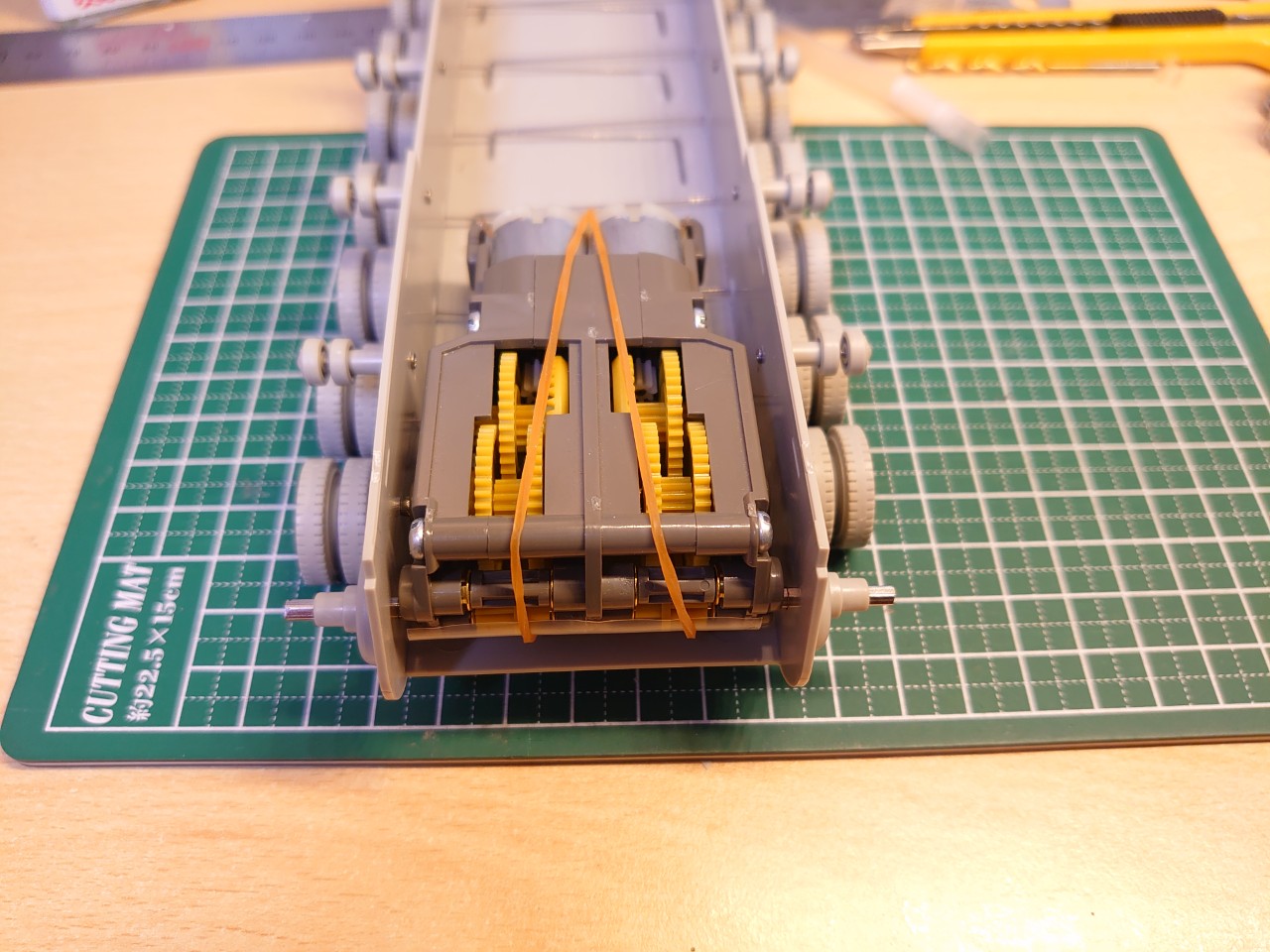 SU-100Yにタミヤのギヤボックスを輪ゴムで仮止めしている様子です。六角シャフトの長さが程よい感じです。今回はこの六角シャフトの端にドライブホイールを接着していこうと思います。