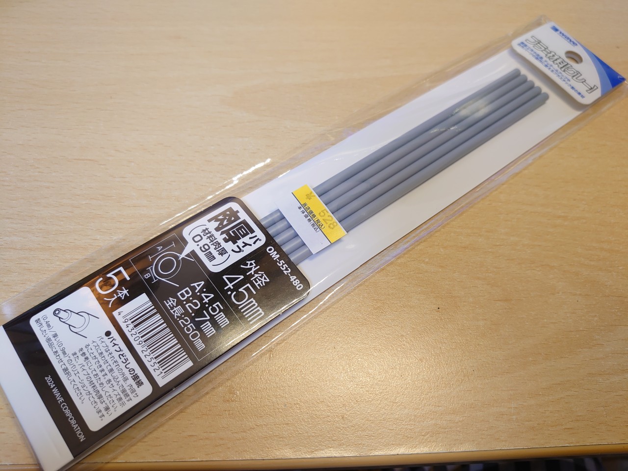 なので、外径が45mmの「ウェーブ マテリアルシリーズ プラパイプ グレー 肉厚 外径4.5mm 5本入 ホビー用素材 OM-552」という商品を使ってみようと思います!こちらの商品の内径は2.7mmなので、六角シャフトの3mmより少し細いですが、そこは後で微調整しようと思います。
