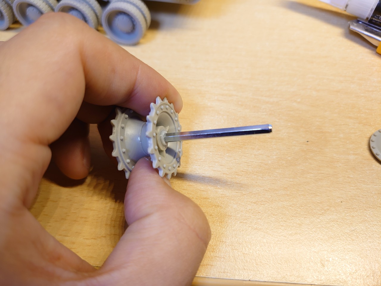 プラパイプを10mmくらいの長さにしてみました。これをドライブホイールに接着してしまいます。途中の写真を取り忘れてしまったので文章で説明します。瞬間接着剤を使ってプラパイプをSU-100Yのドライブホイールに接着して、その後3mmのドリルで内側を削りました。削った所に3mmの六角シャフトを入れて、それも瞬間接着剤で接着した感じです。