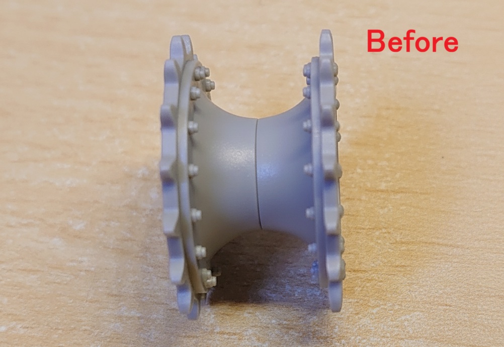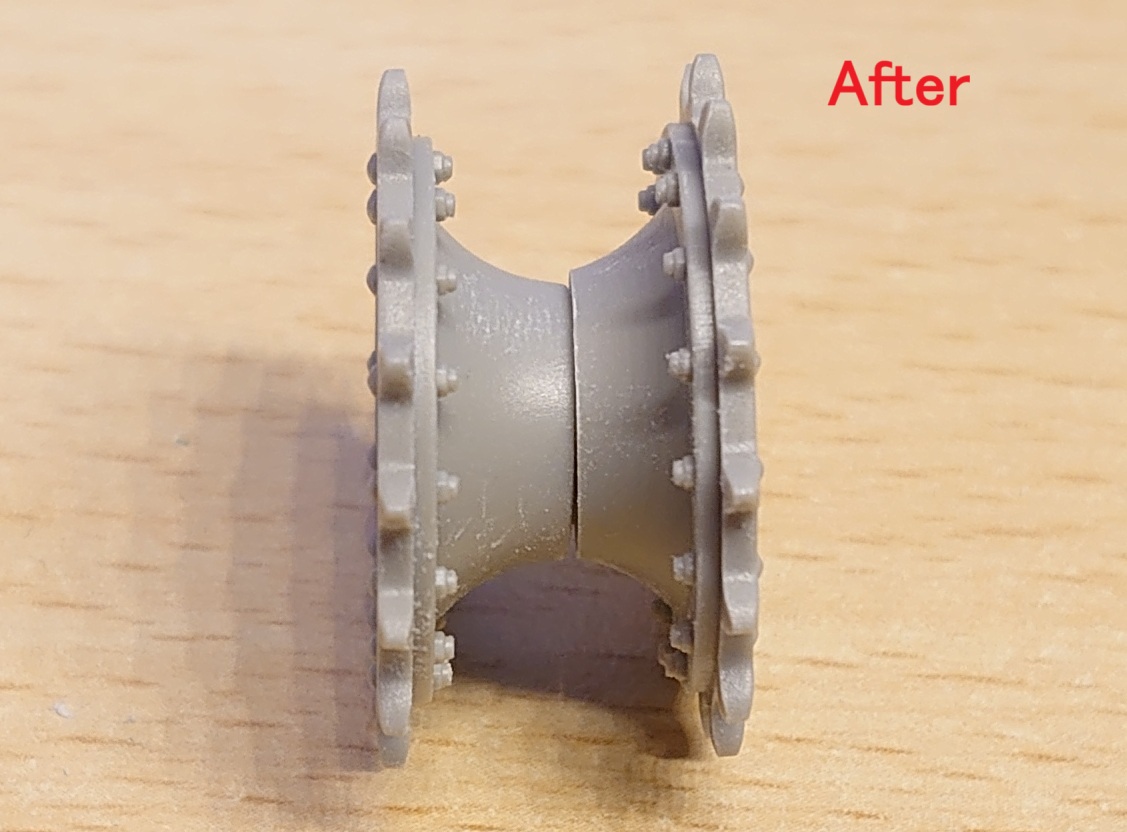 という訳でドライブホイールを細くします。当初SU-100Y専用のドライブホイールをCADで作って、3Dプリンタで出力させようかなと考えていました。ただ、光造形の3Dプリンタで出力したパーツを使って金属履帯を動かすと、強度の関係ですぐにボロボロになるそうな気がしたので、元のキットのドライブホイールを削って細くする事にしました。