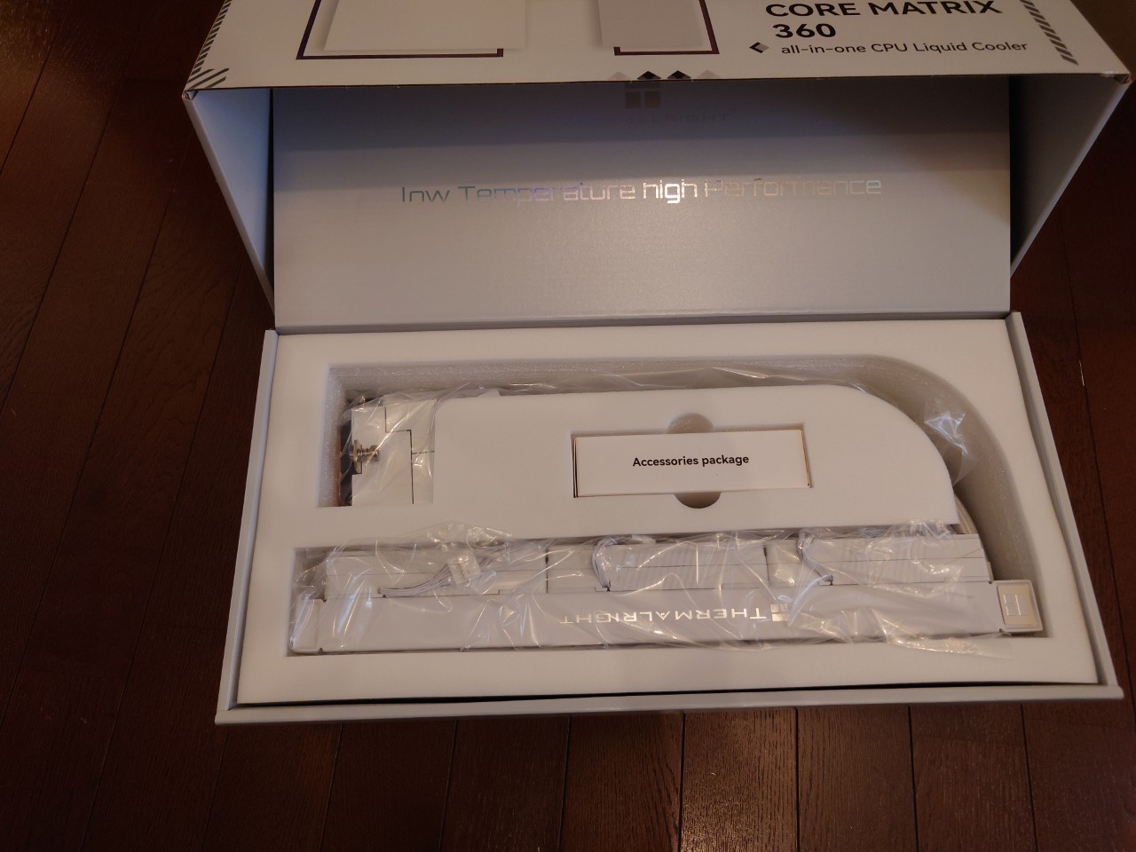 THERMALRIGHTの「Core Matrix 360 White 120mm PWMファン付きCPU液体クーラー」というヤツです。12cmのファンが3連でついている簡易水冷クーラーになります。