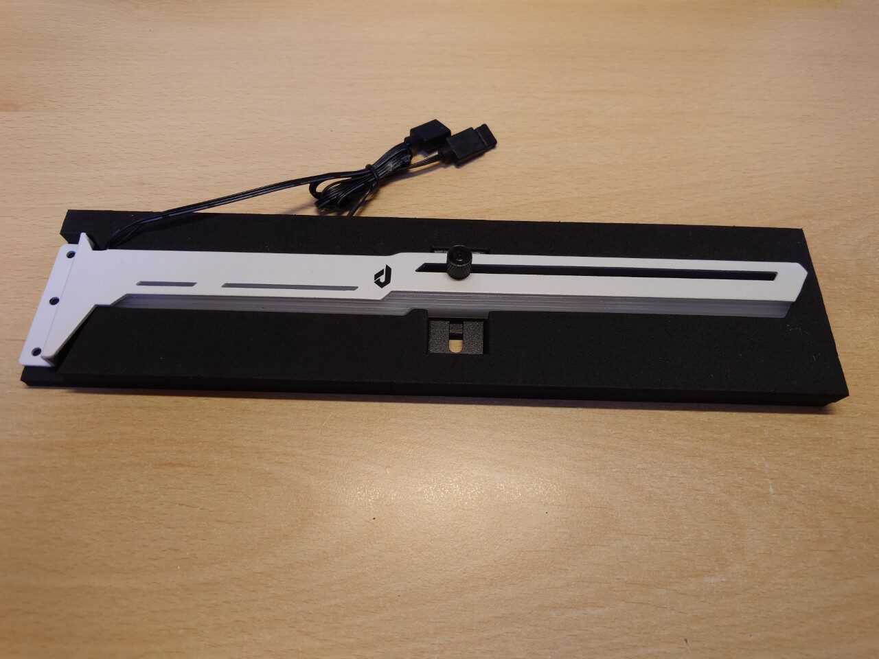 こんな感じでケースの一番上の所に内側かた取り付ける感じですね。FAN部分はよくある乳白色ではなく白一色でした。FANの羽部分でARGBの光を拡散されるのではなく、FANの周辺四か所の部分が光る仕様らしいです。