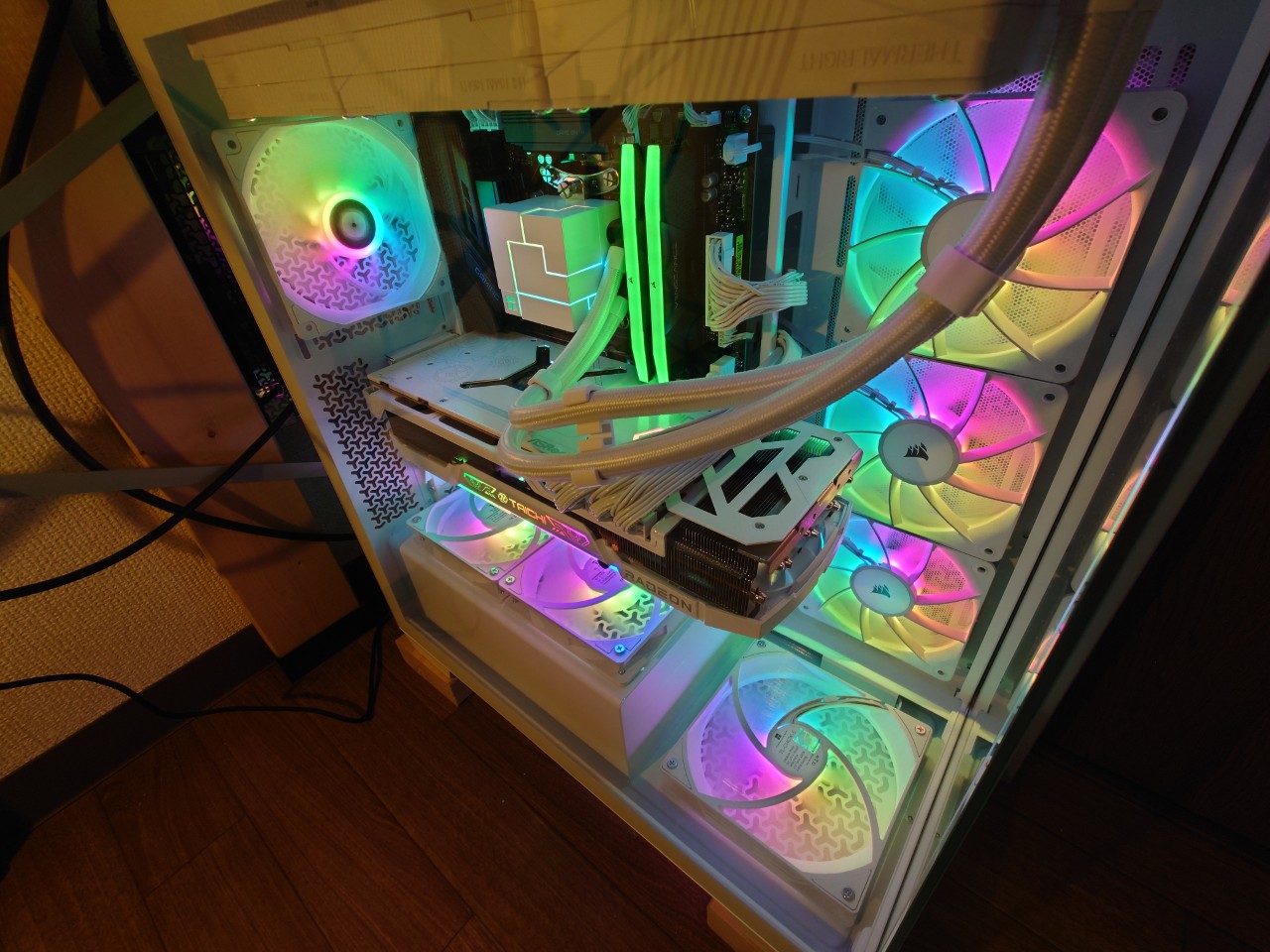ちなみに動画だとこんな感じです。以前はPCの内側を光らせる事にそこまで意味を見出せなかったのですが、いざホワイトのピラーレスケースとARGBで光らせまくると結構テンション上がるもんですね笑。