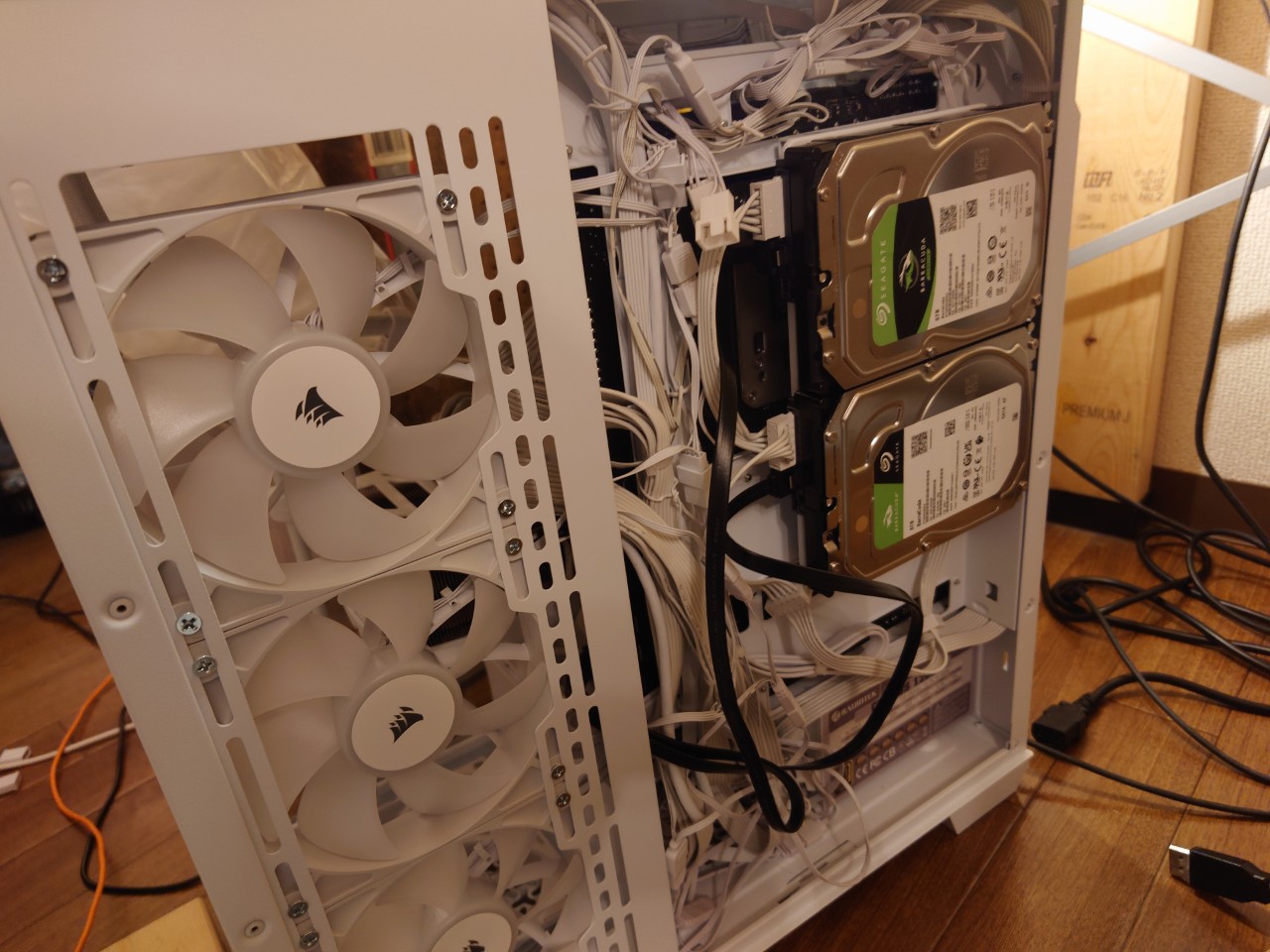 PCケースの裏側というか、右側のパネル裏には数センチの余裕があり、ここに3.5インチのHDDドライブを配置できます。私は結構写真や動画を撮影するのでストレージ容量が必要な人間です。なので6TBと8TBのHDDを取り付けています。ちなみに8TBのHDDは2023年6月にAmazonで13,000円で購入した物です。今は31,980円するらしくて、当時2つ買っておけばよかったと後悔しています。