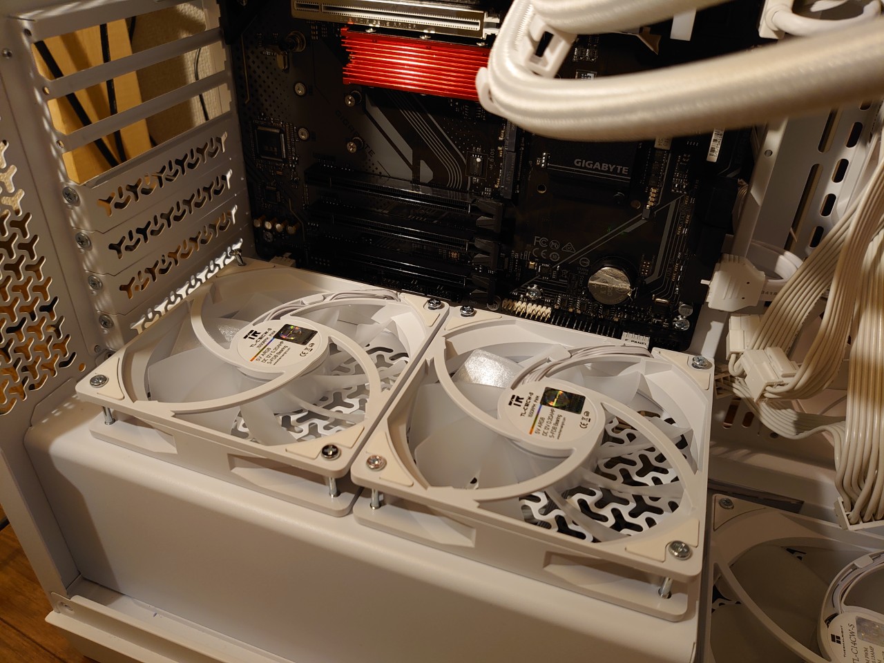 この辺のパーツを取り付けてみた所、こんな感じになりました。失敗したのはマザーボードが黒いので、ここも白いヤツを選べばよかったです笑。まぁ白と黒の二色しかないので、これはこれでPS5みたいで良いかなと言う感じもします。