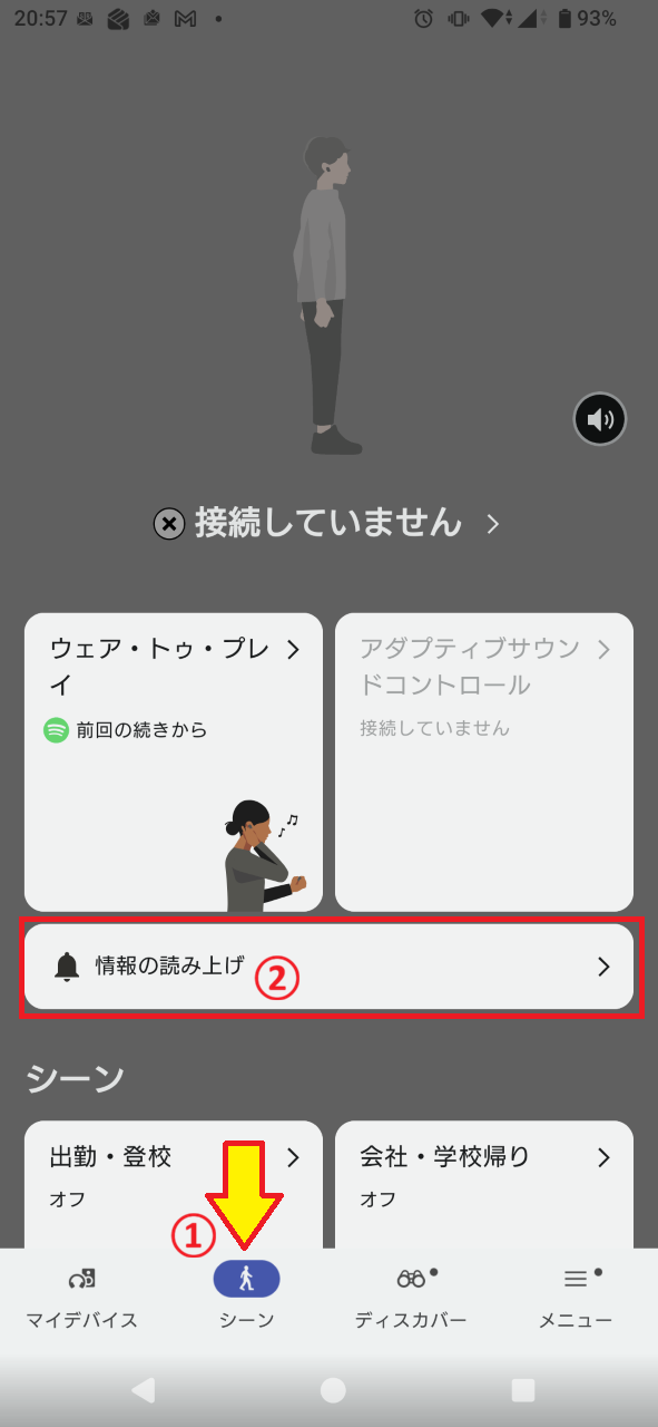「Sound Connect」を起動し、下の4項目の中から「シーン」を選択し、「情報の読み上げ」を選択します。