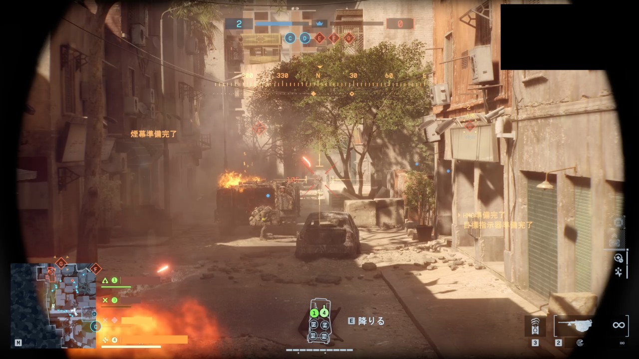 こちらは戦車戦の様子です。主砲を撃っている最中に、前を素通りするヤツとか、ぶつかってくるヤツとか、もうカオスです。BF3でもエイブラムス戦がありましたが、雰囲気はBF3の方が良いですね。というかBF3は10年以上前(2011年発売)のゲームですが、全体的なクオリティが凄かったなと再認識しました。