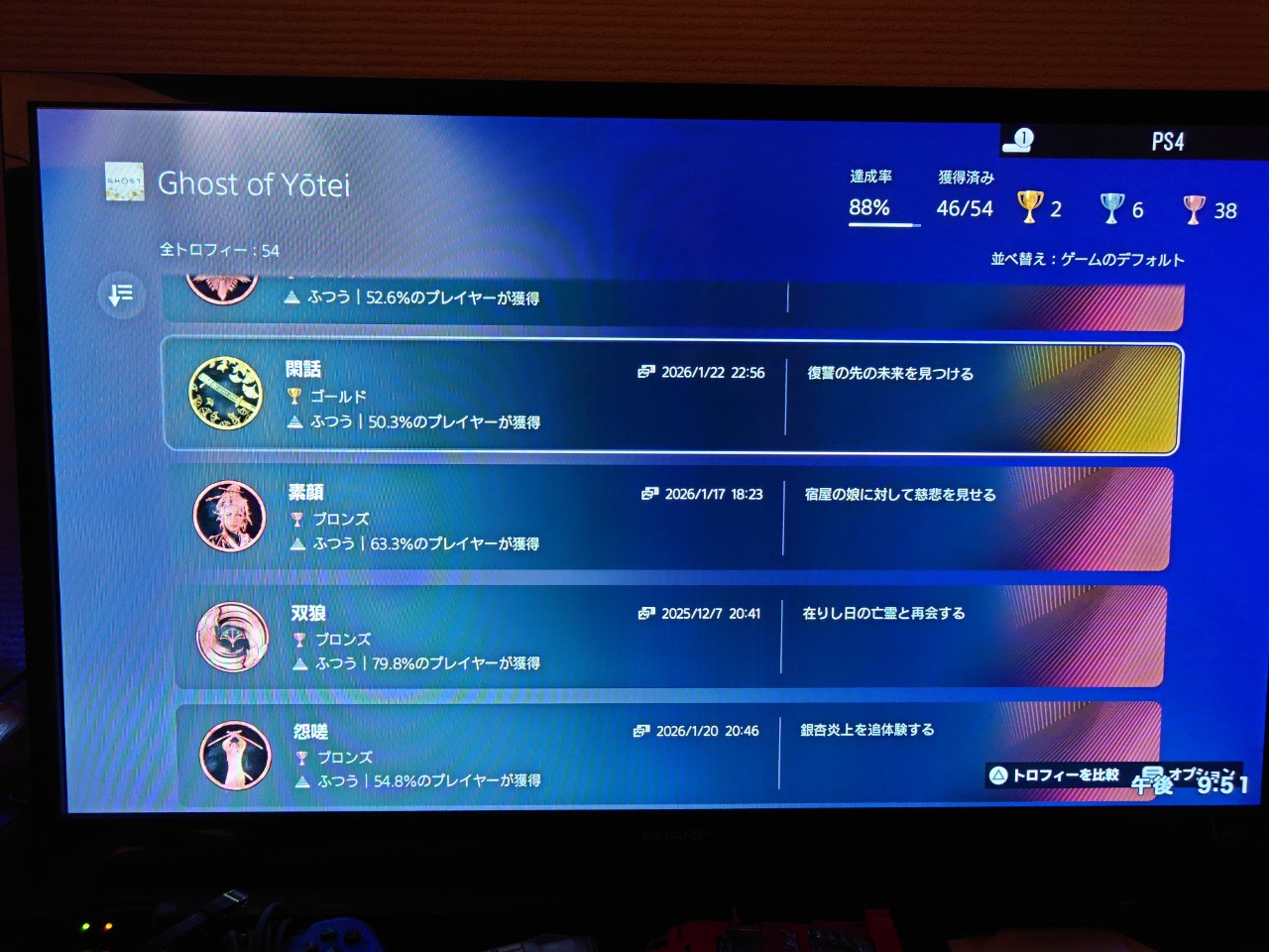 話は変わりますが、最近やっとゴースト・オブ・ヨウテイをクリアしました!最近はBF6を結構やっていて、こちらは全然プレイできていなかったのですが、ここ数日終わらせようと思って仕事終わりにちまちま進めていた感じです。トロフィーコンプリートはまだできていないですが、ストーリーが一通り終わった感じですね。とても面白かったです!色々話したい事はありますが、ネタバレ含んでしまうので控えます。北海道民からの突っ込みとしては「北海道にそんなに大量に竹林は無い」や「そんなデカい雪虫がいるか」といった物はあるかも知れませんがゲームなので野暮な突っ込みですね。ゴーストオブツシマの方もプレイしたくなりました。