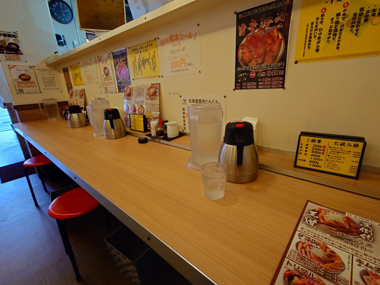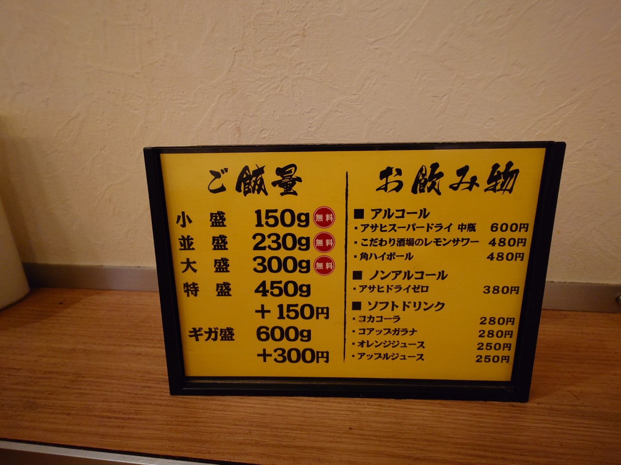 こちらはメニュー立ての所に書いてあるサイドメニュー情報です。豚丼を頼む際に、この左側の「ご飯量」を聞かれるので、この中から選ぶ感じです。小盛~大盛まで無料なのありがたいですね!あとはアルコール類の提供もあるみたいです。