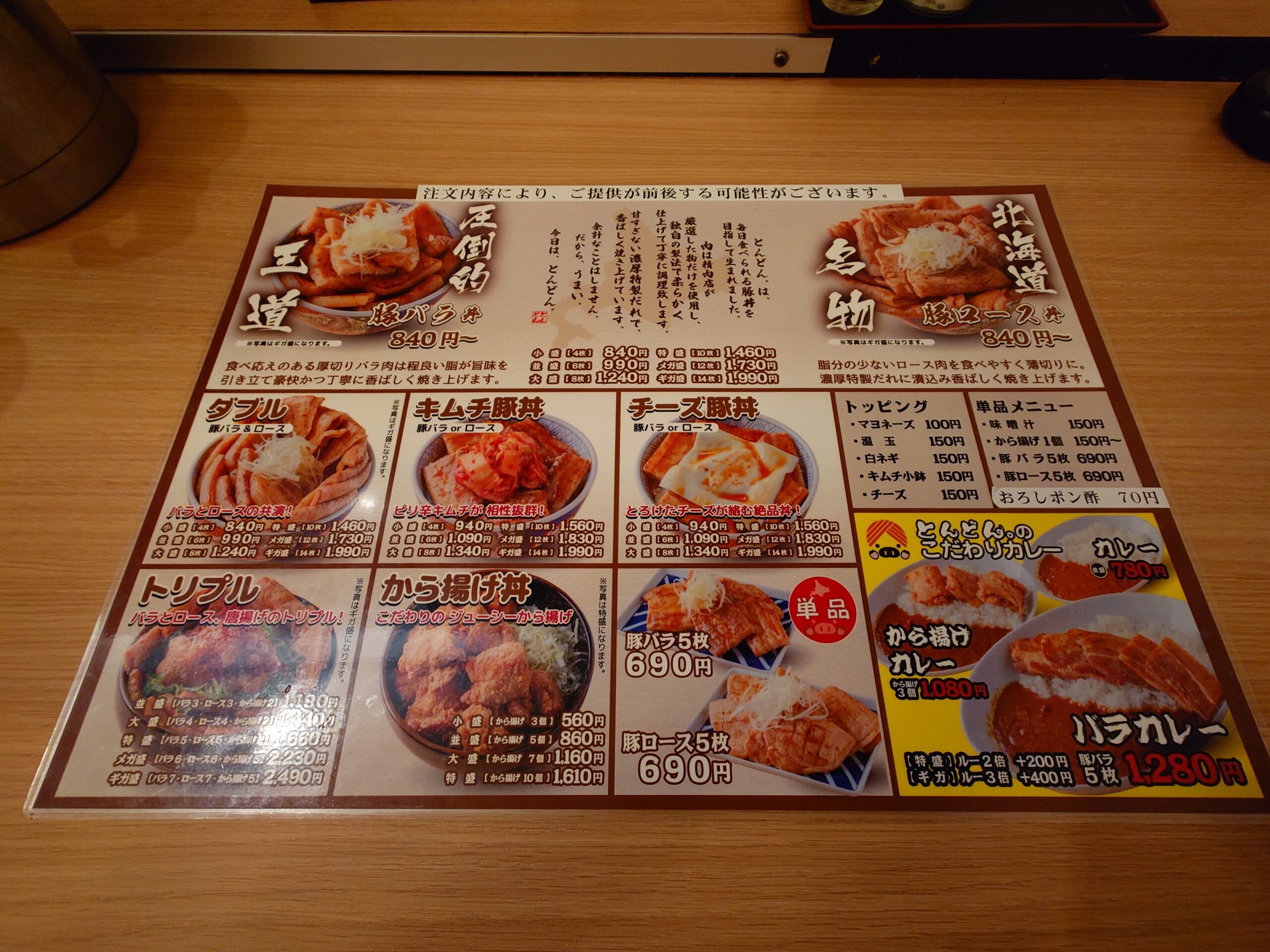 各席にラミネートされたメニュー表があります。片面印刷で裏側はありません。王道として豚バラ、名物として豚ロースを押しているようです。あとカレーメニューもあるんですね!
