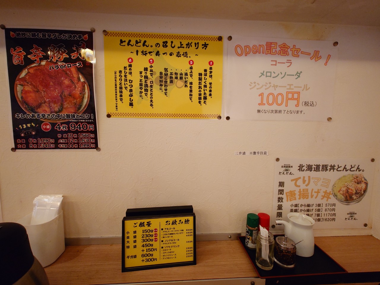こちらは壁に貼られていた物です(クリックしたら拡大できます)。Openして2か月程なので、ジュース類が100円で提供されているみたいです。期間限定で「てりマヨ 唐揚げ丼」というのもあるみたいです。あと旨辛豚丼というのもあるようで、これもちょっと気になります。中央には食べ方についての解説が掲載されています。