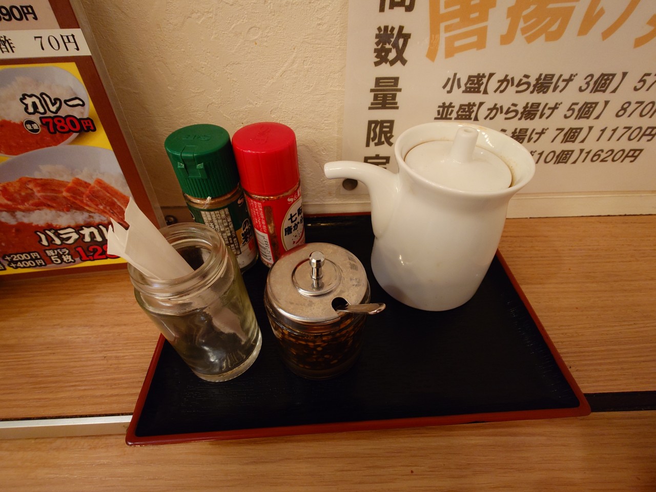 こちらは各席にある調味料ですが、右側の白い容器が豚丼のタレで、足りない時は追いタレできるのが嬉しいですね!色々かけてみましたが、個人的には山椒との相性が良かったと思います。