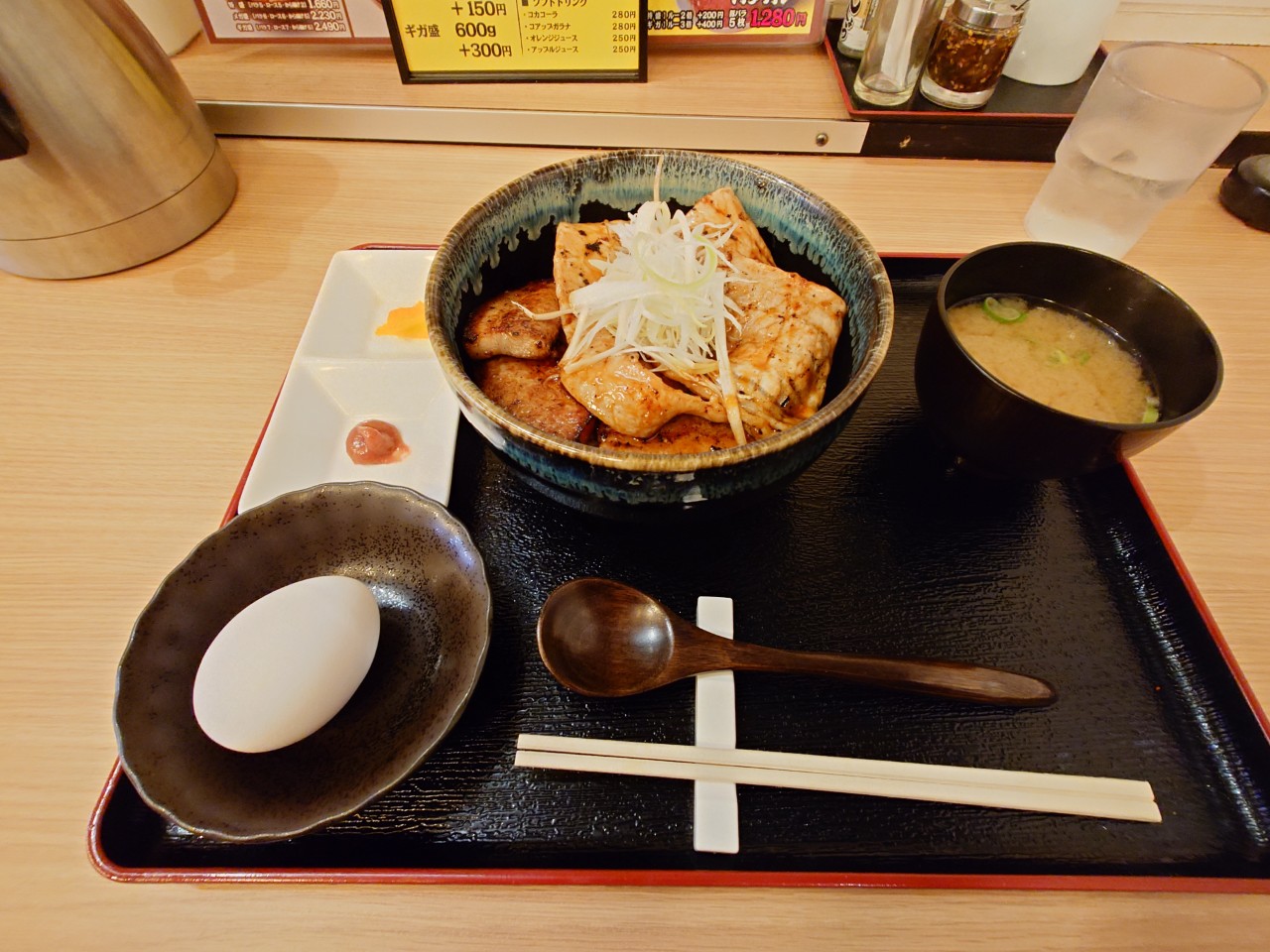 こちら「ダブル(豚バラ&ロース)並盛 ご飯並盛(230g)」990円です!豚バラとロースで迷ったら、美味しい所取りのこちらにするのが良さげですね!トッピングで温玉150円も頼んでみました!温玉は別皿でくるタイプで、卵を自分で割るスタイルです。画面左上の小皿には上に漬物(たくあん)。下に練り梅(最初色合い的に味噌かと思いました)があり、中盤これらで口を整えるらしいです(って壁に書いてました笑)。豚丼を頼むと味噌汁もついてくるようです。豚肉上には白髪ネギが乗っていて、よく十勝豚丼で見る見た目ですね。タレは甘めで、しつこくなく、豚肉に合っています。豚バラは結構厚く脂が乗っていて食べ応えがあります。ロースは豚バラと比較すると薄目ですが柔らかくて美味しかったです。